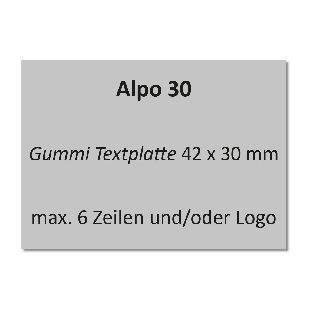 Textplatte 42x30 mm für Alpo 30. Wir empfehlen bei einem Textplatten-Austausch um auch das Stempelkissen auszutauschen da sich nach längerem Gebrauch die alte Stempelplatte in das Kissen eingedrückt hat und dadurch die neue Textplatte nicht mehr sauber eingefärbt werden kann.