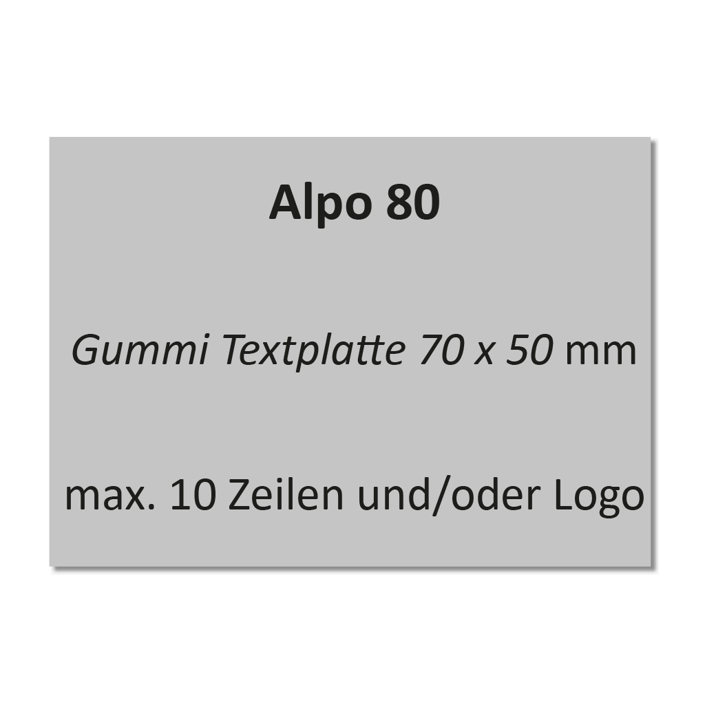 Textplatte 70x48 mm für Alpo 80. Wir empfehlen bei einem Textplatten-Austausch um auch das Stempelkissen auszutauschen da sich nach längerem Gebrauch die alte Stempelplatte in das Kissen eingedrückt hat und dadurch die neue Textplatte nicht mehr sauber eingefärbt werden kann.
